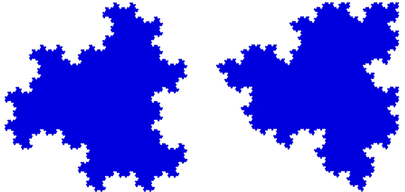 The scaling factor from one generation to the next is 1/√3, and the rotation angle is 30 degrees. There is a single reptile without mirroring and a distinct one (right figure) with mirroring between successive generations.
