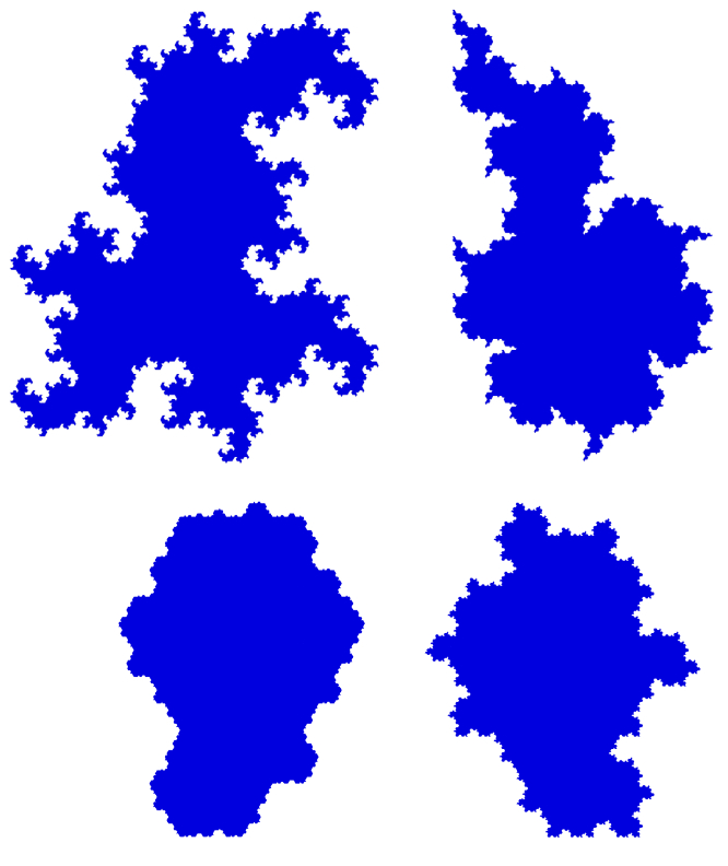 The scaling factor from one generation to the next is 1/2. A reptile is allowed for rotations of 60 and -120 degrees (left), with another two allowed by mirroring between successive generations (right).