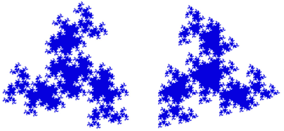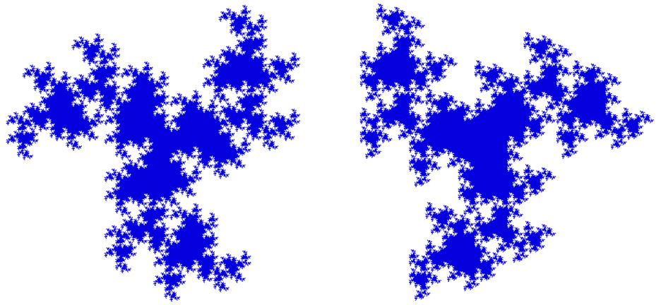 The scaling factor from one generation to the next is 1/3, and two rotation angles are allowed, 0 (top) and 60 (bottom) degrees. There is no mirroring in the left reptiles and mirroring between successive generations in the right reptiles.