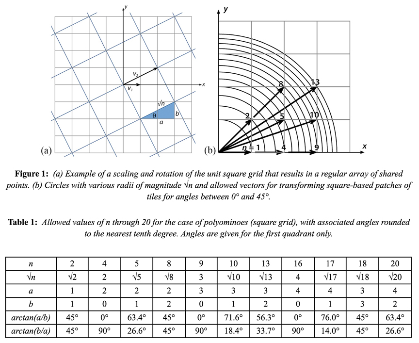 2. Scale by 1/√n about the origin and either rotate or reflect the polyomino according to allowed angles from Table 1. Form the first iteration by arranging n copies of the polyform in identical fashion to that by which the polyomino was built.
