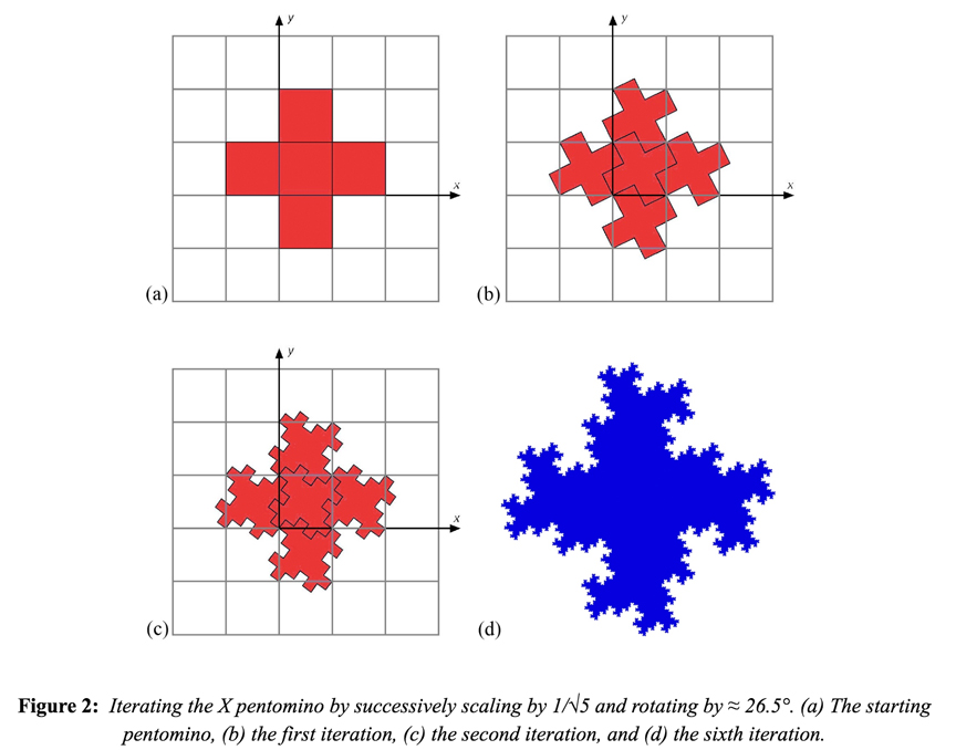 The method is illustrated in Figure 2 for the case of the X pentomino. Starting with a square with lower left corner at the origin, the pentomino is generated by translating copies one unit in each of four directions. With n = 5 there is an allowed rotation angle of approximately 26.6°. Rotating the starting polyomino by that amount about the origin and scaling by √5 results in a smaller X with vertices that coincide with those of the starting square. Scaling and translating four copies of this by one unit in each of four directions yields the patch of Figure 2(b). After another iteration, Figure 2(c) is obtained, with Figure 2(d) showing the tile after six iterations. At this scale, it is essentially indistinguishable from the fractal reptile that would be obtained after an infinite number of iterations. The fractal tile tessellates the plane and can be subdivided into five smaller copies of itself.