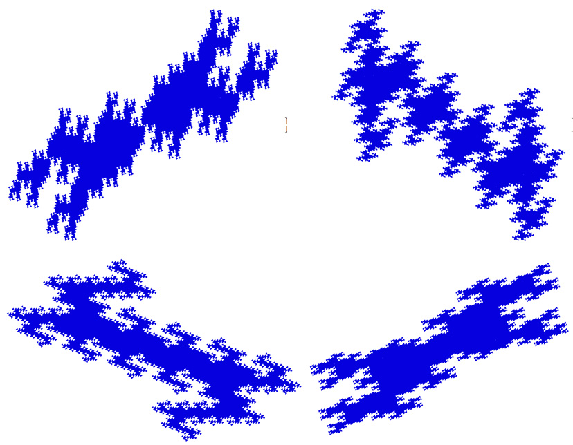 The scaling factor from one generation to the next is 1/√7. Distinct reptiles are allowed by rotations of 19.107 and 139.107 (left and right, respectively, top row below), with three more reptiles allowed by mirroring between successive generations (bottom row below).