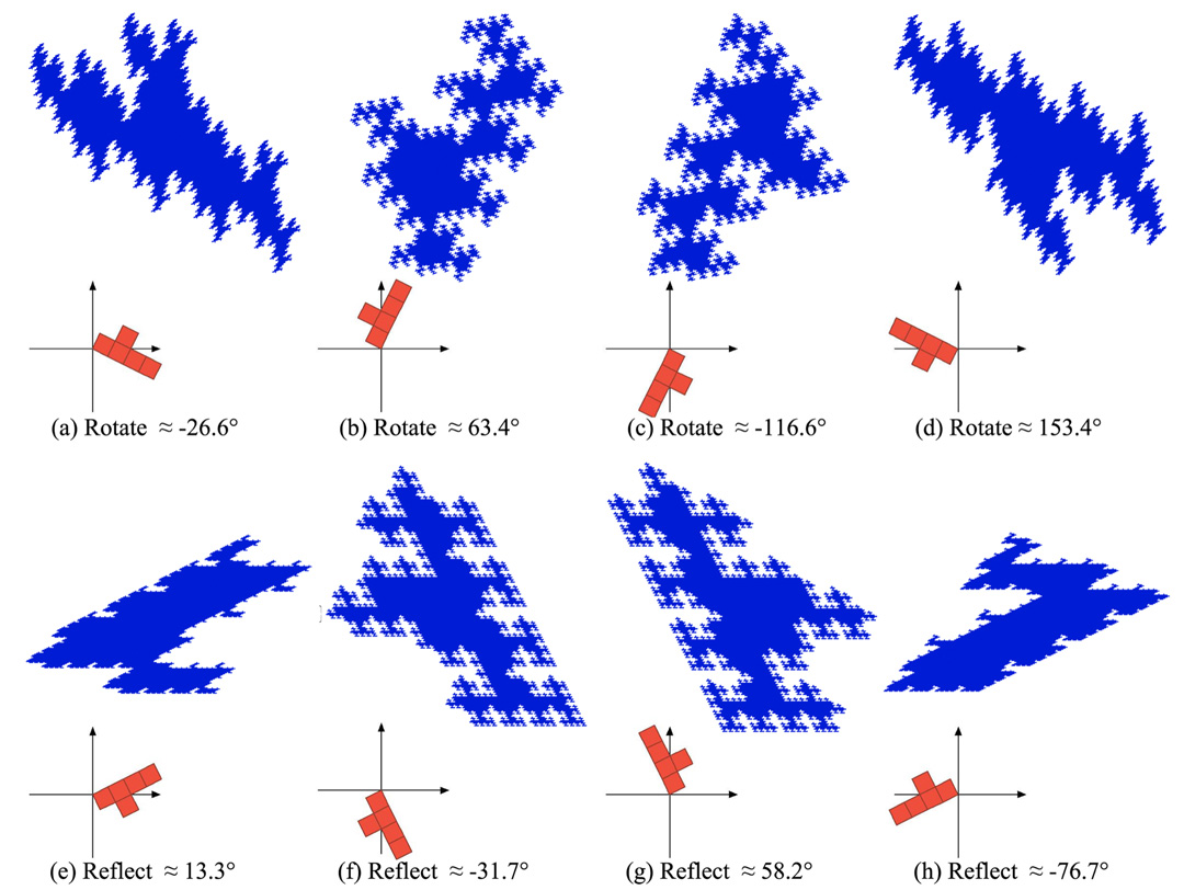 The scaling factor from one generation to the next is 1/√5. The lack of symmetry in the pentomino leads to four reptiles without mirroring and four more with mirroring between successive generations.