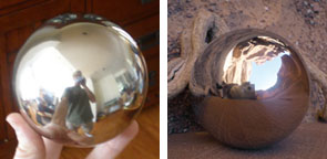 Mirrored spheres create fascinating distortions of one's surroundings. M.C. Escher employed a mirrored sphere in one of his most famous prints, "Hand with Reflecting Sphere" (1935). He also employed mirrored spheres in "Still Life with Spherical Mirror" and "Three Spheres II". This affordable sphere is constructed of stainless steel. The quality of the reflection is good, though there are small areas where the reflection is somewhat distorted. 4" diameter (10 cm).