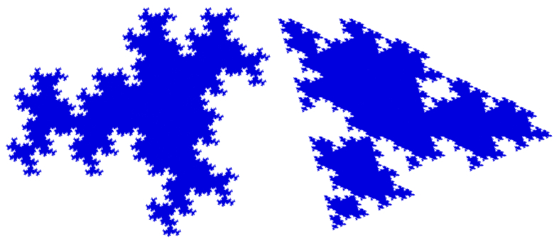 Using square- or triangle-based grids, there is no overlapping transformation of the grid for n = 6, meaning n = 6 fractal self-replicating tiles are not allowed. By distorting a grid, for example stretching a rhombus grid, n=6 becomes allowed. The diagonals of the rhombic building block are 1 and √15/3. The scaling factor from one generation to the next is 1/√6, and the rotation angle is approximately 52.239 degrees (left), with mirroring between successive iterations on the right.