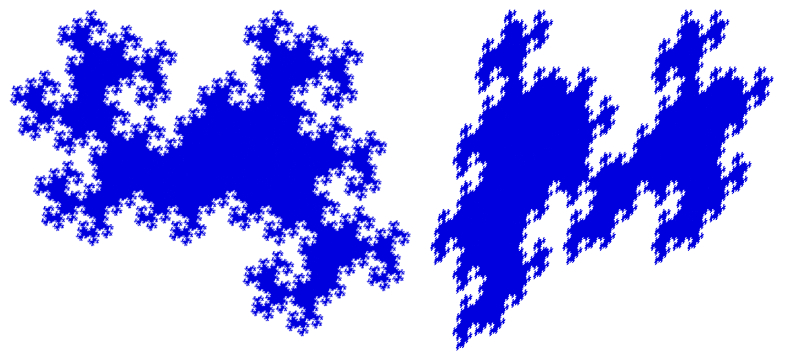 Using square- or triangle-based grids, there is no overlapping transformation of the grid for n = 6, meaning n = 6 fractal self-replicating tiles are not allowed. By distorting a grid, for example stretching a rhombus grid, n=6 becomes allowed. The diagonals of the rhombic building block are 1 and √15/3. The scaling factor from one generation to the next is 1/√6, and the rotation angle is approximately 52.239 degrees (left), with mirroring between successive iterations on the right.