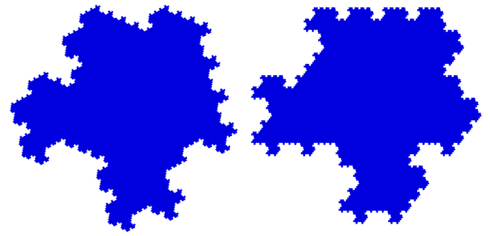 Using square- or triangle-based grids, there is no overlapping transformation of the grid for n = 6, meaning n = 6 fractal self-replicating tiles are not allowed. By distorting a grid, for example stretching a rhombus grid, n=6 becomes allowed. The diagonals of the rhombic building block are 1 and √15/3. The scaling factor from one generation to the next is 1/√6, and the rotation angles are approximately 52.239 degrees (left), and 127.761 degrees with mirroring (right) between successive iterations. The first angle with mirroring and the second without are also allowed, but the fractals are similar in appearance.