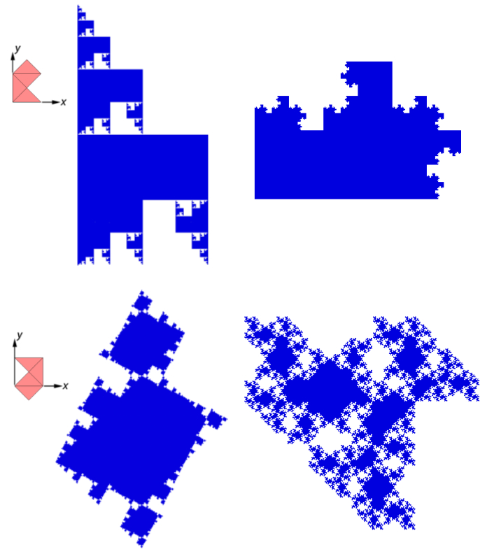 The scaling factor from one generation to the next is 1/2, and the rotation angle is 0 degrees. The details of the construction of the starting polyform matter, such as the location of points the triangles are rotated about. Two different choices for the location of the origin are shown here, resulting in two different reptiles. On the right, reptiles resulting from mirroring between successive generations are shown.