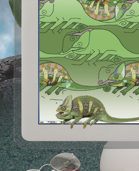 M.C. Escher designed his tessellations using pencil and paper, while Robert Fathauer designs his directly on a Macintosh computer. One of Escher's best-known prints is "Reptiles", in which a reptile leaves a page on which the tessellation is drawn to become part of a three-dimensional scene. Of course, the irony is that the "three-dimensional" scene is also just a flat drawing. In "Chameleons", chameleons leave the tessellation on the computer screen to become part of a "three-dimensional" scene that is also in reality just an image on a computer screen. "Chameleons" is a limited edition of 50 prints executed in 2005; the image size is 14 1/2" x 12".