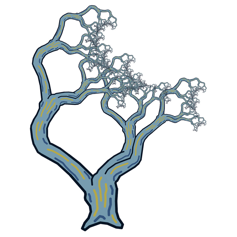 This fractal tree was constructed in 2018 by graphically iterating a building block based on a photograph of the lower branches of a sage bush. It has similar form to "Fractal Tree No. 4", but a very different rendering style.