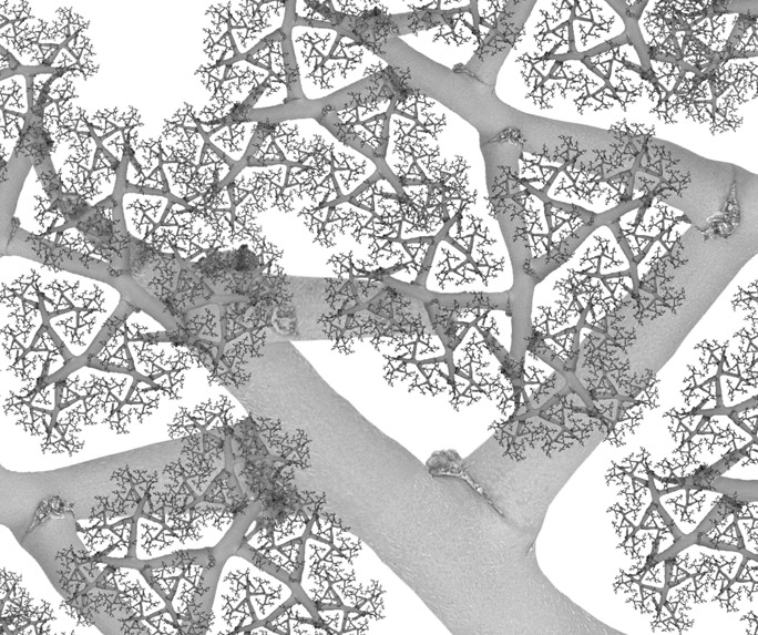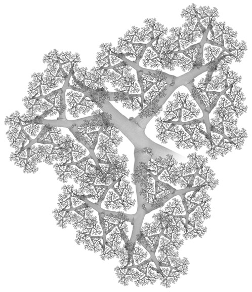 "Fractal Tree No. 10" is a digital artwork constructed by graphically iterating a photographic building block created from photographs of some twigs from a palo verde tree. It is meant to show more of a top view that most of the fractal tree prints. "Fractal Tree No. 10" is a limited edition of 50 prints, completed in 2010.