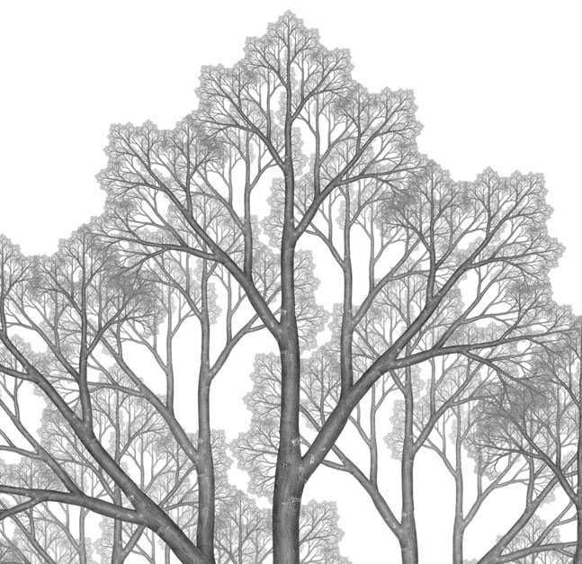 "Fractal Tree No. 3" is a digital artwork constructed by graphically iterating a photographic building block created from photographs of branches of a young mesquite tree. One of the three smaller copies added with each iteration is lightened, providing an illusion of depth in the overlap regions. "Fractal Tree No. 3" is a limited edition of 50 prints, completed in 2007.