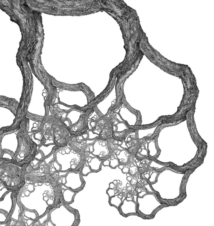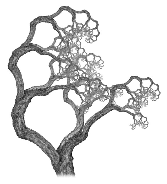 "Fractal Tree No. 4" is a digital artwork constructed by graphically iterating a photographic building block created from photographs of the lower branches of a sage bush. The spiral forms result from the repeated combination of shrinkage and rotation. One of the three smaller copies added with each iteration is lightened, providing an illusion of depth in the overlap regions. "Fractal Tree No. 4" is a limited edition of 50 prints, completed in 2007.