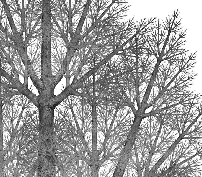"Fractal Tree No. 9" is a digital artwork constructed by graphically iterating a photographic building block created from photographs of a mesquite tree. "Fractal Tree No. 9" is a limited edition of 50 prints, completed in 2010.