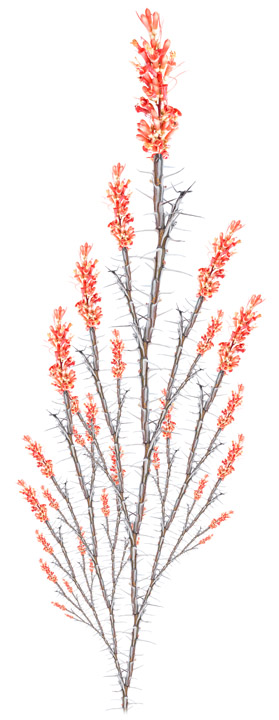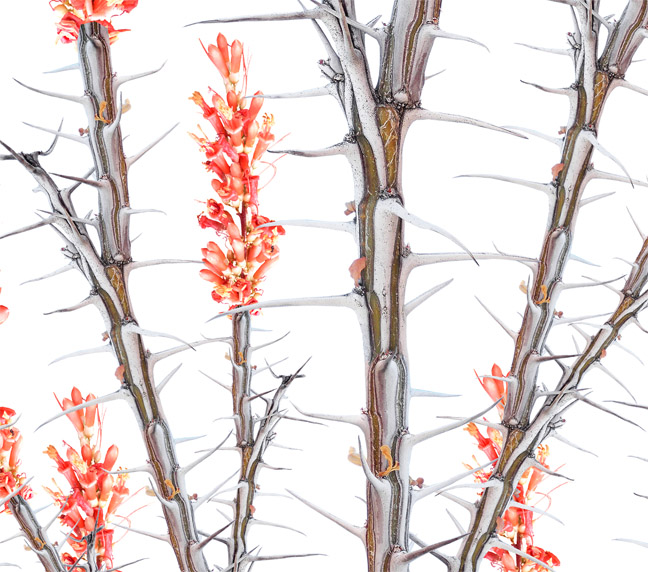 "Ocotillo in Bloom, Iterated" is a digital artwork constructed by graphically iterating photographic building blocks created from photographs of two different ocotillos taken in April of 2011. This desert plant is covered with leaves after sufficient rain, but drops its leaves during dry times. The portion used for the branch segments in the print is new growth, which exhibits lighter and more vibrant color than older growth. In the print, a building block with a cluster of flowers and a terminating branch was used at the beginning of the iteration process, while a building block without these terminating features was used for subsequent iterations. During the construction process, the number of copies of the building block with flowers increases with each step. "Ocotillo in Bloom, Iterated" is a limited edition of 50 prints, completed in 2011.