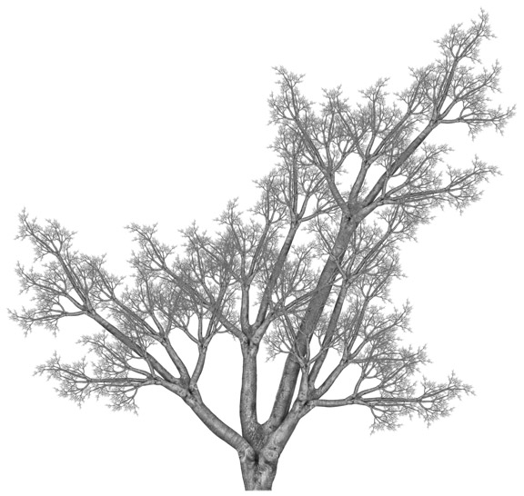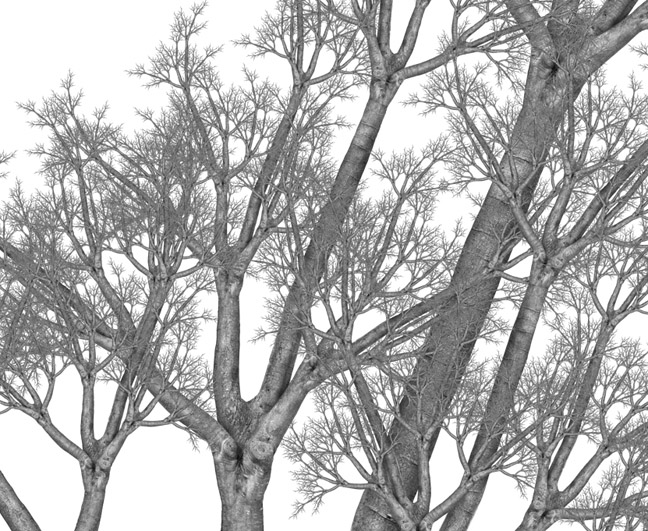 "Randomozed Fractal Tree No. 2" is a digital artwork constructed by graphically iterating the same photographic building block used for "Fractal Tree No. 6". In this case, a die was rolled with each iteration to determine whether or not to reflect each of the four branches. This randomized construction process led to a more natural looking tree. "Randomized Fractal Tree No. 2" is a limited edition of 50 prints, completed in 2010.