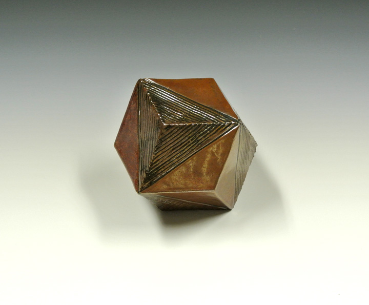 Triangles are delineated on this rhombic dodecahedron that illustrate the relationship between the rhombic dodecahedron and the octahedron. Glazed cone 10 stoneware, made in 2013.